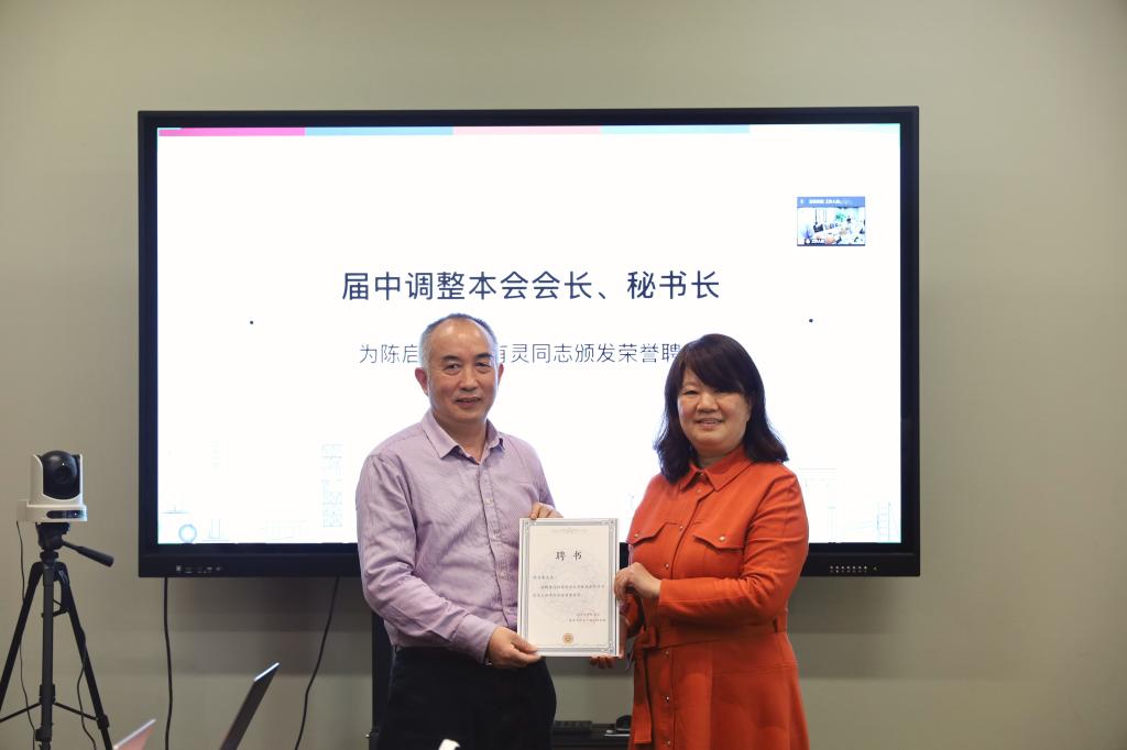 新任会长陈虹在发言中感谢前任会长陈启军、前任秘书长余有灵在校友会工作中的付出与贡献,感谢各位理事的信任与支持,表示接下来将继续努力,着重凝聚校友力量,有效利用校友资源,进一步推动校友与母校、与学院间的交流与联系,让校友们真正感受到母校和学院的温暖。随后,陈虹为陈启军颁发荣誉会长聘书。