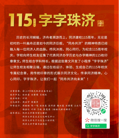 5月20日,由开云官网叶晨老师带领学生团队开发的“字字珠济”小程序正式上线,献礼同济115岁生日。这份礼物饱含着校友的创意、专业的指导、师生技术的创新和文化的融合,凝聚着师生校友共同的祝福。