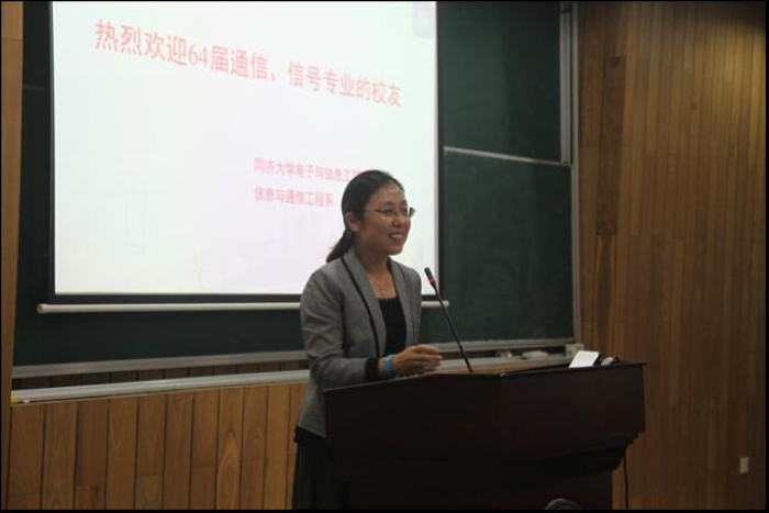 通信工程教研室主任薛小平教授向校友们详细介绍了学校、学院及信通系的情况,着重介绍了面向交通领域的通信与信息关键技术研究,包括轨道交通、地面交通及海洋通信的研究方向及取得的成果。