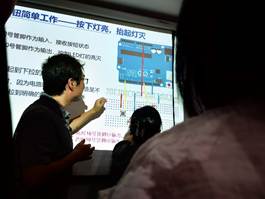 参观过后,活动进入核心环节——Arduino单片机入门实践。为确保安全和学习效果,活动要求每位孩子由一名成人全程陪同。学院工会副主席、资深科创导师任浩琪开讲:“什么是电子电路?如何让代码‘跑’进芯片?”大小朋友们整齐就座,循序渐进地从认识基础电路、LED,到学习使用软件绘制电路图,再到上传程序——当第一颗LED按自己的节奏闪烁,孩子们兴奋地欢呼起来。遇到接线难题时,“大手”握“小手”一起试错。“这是我第一次让LED灯按照我的指令闪烁,太酷了!”一位四年级小朋友激动地说道。