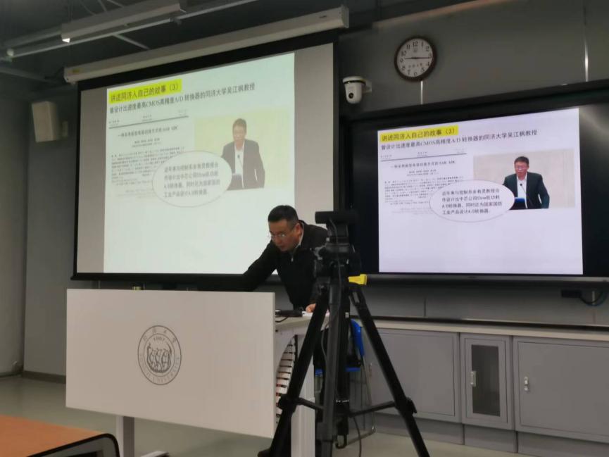 紧接着,岳老师以“同济人的故事”为题,向同学们介绍了开云官网在A/D转换器方面有突出成就的吴江枫和余有灵两位老师,并将他们在该领域的科研成果展示给学生。吴江枫老师长期从事集成电路工艺研究,他与余有灵老师于2017年一起研发出55nm的高速A/D转换电路,为我国集成电路发展做出巨大贡献。