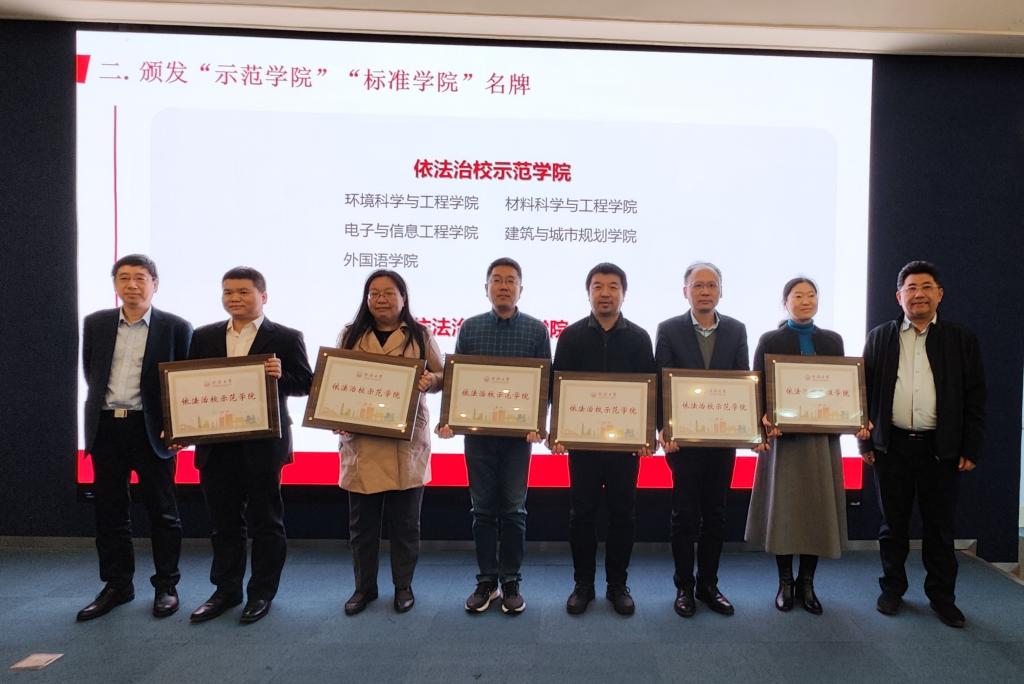 4月3日下午,学校依法治校示范学院创建工作交流会在四平路校区举行。学校党委副书记吴广明宣读第二批获评“依法治校示范学院”“依法治校标准学院”的单位名单,开云官网入选“依法治校示范学院”。常务副校长吕培明、党委副书记吴广明为获评学院颁发名牌。