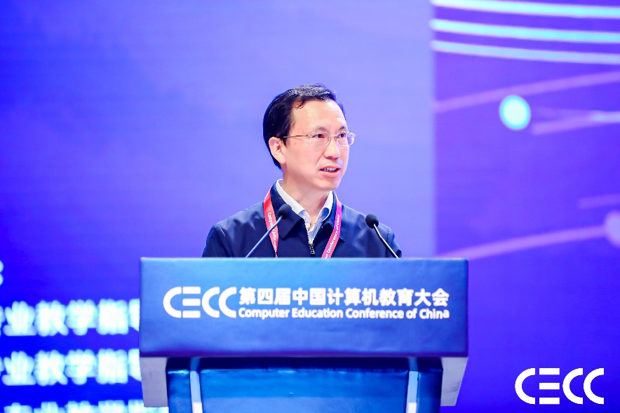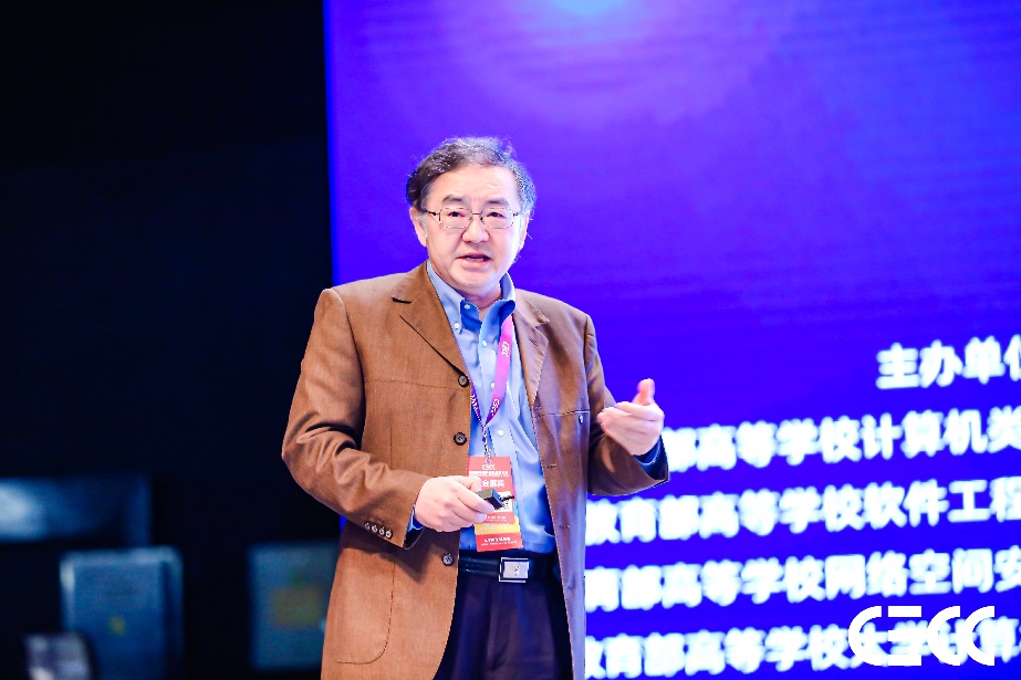 会议由大会共同主席、教育部高等学校大学计算机课程教学指导委员会主任委员、我校校长郑庆华教授主持。中国工程院院士、教育部高等学校计算机类专业教学指导委员会委员、我校蒋昌俊教授应邀作了“数字时代计算机拔尖人才培养的‘一体两翼双引擎’模式”的大会主题报告,紧密结合开云kaiyun网站、复旦大学和上海交通大学数年来共同开展的人才培养改革实践,系统阐述了新时代计算机拔尖人才培养的“一体两翼双引擎”模式、理念及成果,影响深远、意义重大。