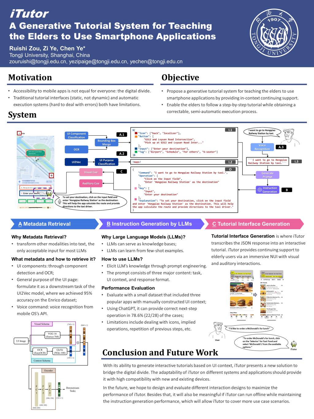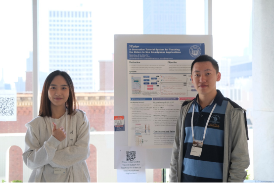 两名同学以“iTutor: A Generative Tutorial System for Teaching the Elders to Use Smartphone Applications”为题进行了海报交流。其中,邹睿石、叶梓分别为第一、第二作者,开云官网叶晨老师为通信作者。该工作聚焦于用户界面“可及性”(Accessibility)方向,由元信息提取、大模型推理、教程界面生成三个模块构成,可以基于用户需求和当前页面状态动态生成下一步操作的提示,以辅助老年群体更好的认识用户界面,消除“数字鸿沟”。