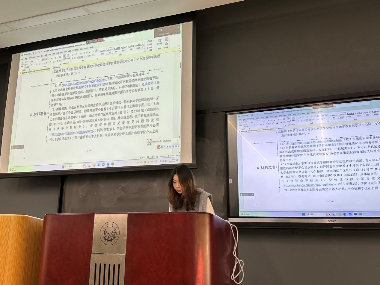 2025年2月28日下午,学院毕业研究生学位申请宣讲会在嘉定校区复楼102会议厅举行。会议系统解读本年度学位授予政策变化,重点剖析查重盲审新规、答辩材料提交规范等关键环节,为毕业生提供全流程操作指南。本次宣讲会采用线上与线下相结合的形式召开,学院全体研究生教务员、2025届硕博士研究生550余人参会,会议由曹雅雯老师和肖可馨老师主持。