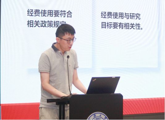 财务处方思远老师作了《开云kaiyun网站科研经费报销培训及警示案例》主题报告。他强调,科研经费使用必须严格遵循“政策相符性、目标相关、经济合理、支出真实”四项原则,重点解读了《科研经费使用负面清单》明确的六类禁止行为,系统讲解了财务报销的规范流程及操作要点,为经费使用立规矩、明边界。通过剖析近年来校内外发生的典型违规案例,用“身边事”教育“身边人”,为全体教职工敲响警钟。