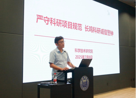 学校科学技术研究院陈海滨副院长以《严守科研项目规范长鸣科研诚信警钟》为题进行政策宣贯。他立足于学校科研发展新形势,介绍了最新修订的科研制度文件,聚焦政策调整要点与执行规范。以典型案例为切入点,对科研项目执行中的常见问题作出重要风险提示,提出明确要求。通过分析校内外典型学术不端案例强化警示教育,为全体教师筑牢科研诚信防线。他强调,教师应自觉践行新时代科学家精神,严守学术道德底线,恪守科研规范红线,筑牢思想防线,强化使命担当。