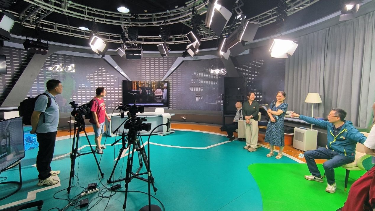 随后,在技术中心党支部党员的陪同下,教工第九党支部的老师们实地参观了新闻演播厅、访谈节目录制间等核心工作区域。技术专家现场演示了新闻节目的录制流程,重点讲解了虚拟演播室技术、多机位切换系统以及高清视频信号的传输处理等关键技术。大家特别关注了电视画面从采集、编辑到最终合成的全过程,并就5G传输、人工智能剪辑等前沿技术与电视台技术人员展开了深入讨论。