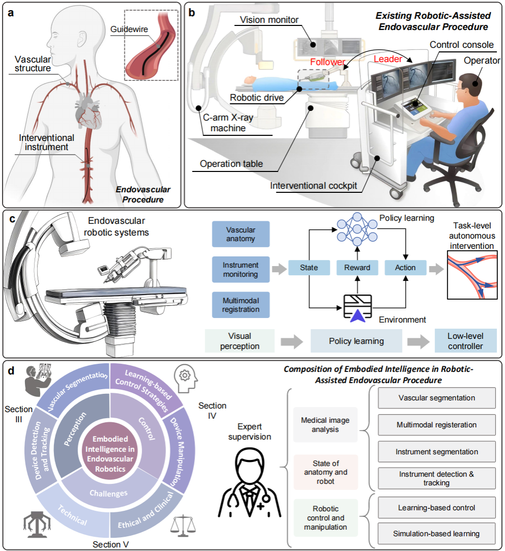 近日,开云官网控制科学与工程系齐鹏副教授团队在IEEE生物医学工程领域权威综述期刊《IEEE Reviews in Biomedical Engineering》(中科院一区TOP期刊,IF=12)发表题为“Advancing Embodied Intelligence in Robotic-Assisted Endovascular Procedures: A Systematic Review of AI Solutions”的系统性综述论文。该成果面向血管介入手术机器人这一高端医疗装备关键方向,围绕具身智能的“感知-决策-控制”范式,系统梳理人工智能驱动的研究进展,提出面向临床可转化的技术路线与发展框架,为介入手术机器人由“主从遥操作”向“人机协同的增强智能”演进提供系统化参考。