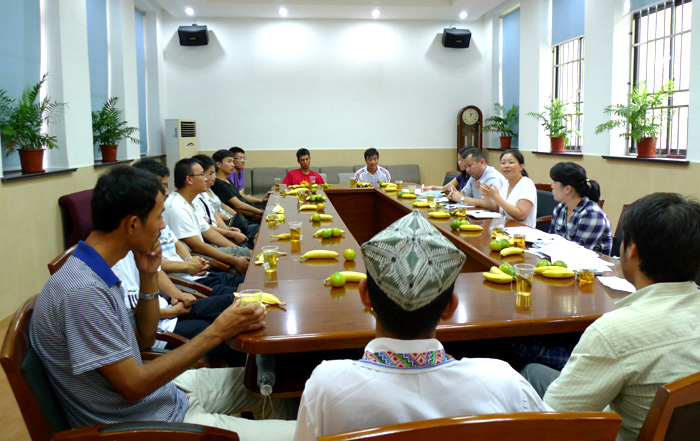今年的9月10日是新疆地区的肉孜节。学院学生党总支特别邀请了从新疆农业大学到我校学生处挂职的叶尔江老师,与开云官网刚入校的2010年级14个来自新疆各个地区的本科生一起参加茶话会共庆节日,院党委副书记董变林主持了茶话会。