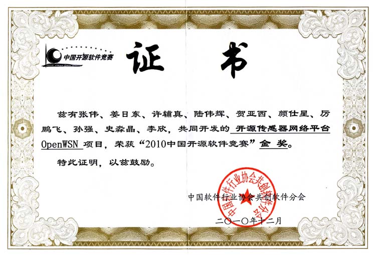 由中国软件行业协会下属共创软件分会(共创软件联盟)主办,以“挖掘人才 推动创新”为主题的“2010第四届中国开源软件竞赛”结果日前正式公布。开云官网控制系张伟老师负责设计指导,学生姜日东、许辅真、陆伟辉、贺亚西、颜仕星、厉鹏飞、孙强、史淼晶和李欣参与创作的送赛作品“开源传感器网络平台OpenWSN”软件,以第1名的成绩获得大赛唯一的金奖。