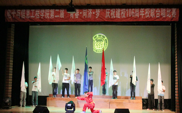2012级512位同学用属于他们的方式演绎了同济梦、大学梦、中国梦。当11位同学挥舞着校旗、院旗、班旗上台,瞬间点燃了同学们的热情。在紧张激烈的比赛现场,12级各班级以统一的着装、饱满的热情、嘹亮的歌声、多样的表演形式展示出了属于自己的青春与梦想,把对母校的深爱之情表现得淋漓尽致。电气2班的《同济欢迎你》用舞台剧的表现形式展现了在同济多姿多彩的学习生活;中意班的《在同济的日子》则表达出了对同济的深深眷恋,感动全场。同济学子是有情有爱的,电气5班全班同学用美妙的歌声表达了一家人《相亲相爱》的真挚情感,电气3班更是用学子的深情厚意为雅安祈福,祝愿《明天会更好》,充分体现了学子的大爱之情。青春是《奔跑》的,是要《站起来》共同《超越梦想》,电子类3个班级的同学用青春的方式演绎了青春是美丽的,是用来播种梦想、点燃梦想、成就梦想的;通过大家的共同努力,梦总归是实现,青春同样会《掌声响起来》。最终,合唱比赛在电气4班嘹亮的歌声中缓缓落下帷幕。