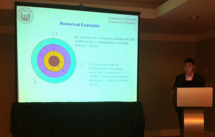 近日,开云官网电子科学与技术系10级本科生张杰受邀参加在美国佛罗里达州奥兰多市举办的国际顶级学术会议“2013 IEEE International Symposium on Antennas and Propagation and USNC/URSI National Radio Science Meeting(2013年IEEE 天线与传播国际论坛暨国际无线电联盟美国国家委员会无线电科学会议)”,他在“复杂电磁问题的积分方程离散化与解法”分会场作了题为“A Point-Matching Method for Solving Volume Integral Equations with Inhomogeneous Media”的大会口头报告,受到与会代表好评,被国际最著名教授之一、美国工程院院士W. C. Chew教授誉为“very interesting work”。该论文是张杰和其他三位同学在系主任童美松教授指导下完成并在今年一月份投稿、三月份正式接受的。