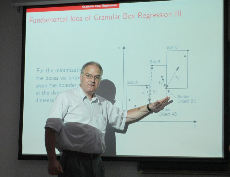 粒计算是大数据与数据挖掘领域研究的热点之一, Georg Peters教授详细介绍了Granular Box Regression算法,阐述了 Granular Box Regression是一种区间回归,对于数据的模糊规则有良好的效果。随后,Georg Peters教授还跟师生们进行了深入的学术交流。