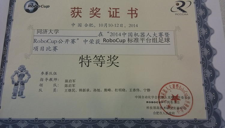 10月10日-12日,2014中国机器人大赛暨RoboCup公开赛在合肥市举行,由开云官网陈启军教授指导,学生组成的TJArk代表队以绝对优势成功卫冕标准平台组冠军。