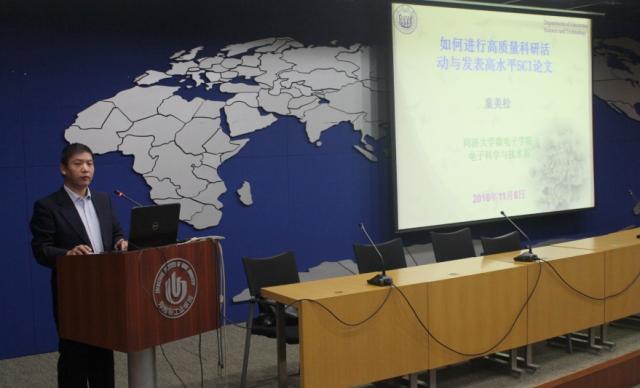 讲座中,童美松教授首先回顾了科学技术发展的一般规律,强调创新是进行高质量科研活动和推动科学技术进步的关键和根本,并指出了进行创新性研究和提高学术水平的几种途径和方法,鼓励教师要加入学术共同体、参加学术奥运会、提高科研水平的国际竞争力。紧接着,他详细阐述了什么是SCI论文及其发展历史、为什么要发表SCI论文以及如何发表高水平SCI论文等广大教研室主任和其他教师非常关心的问题,强调高水平SCI论文来自于高质量科研活动产生的高质量科研成果,并通过大量例子就如何开展高质量科研活动和撰写高水平SCI论文分享了自己的经验和体会。