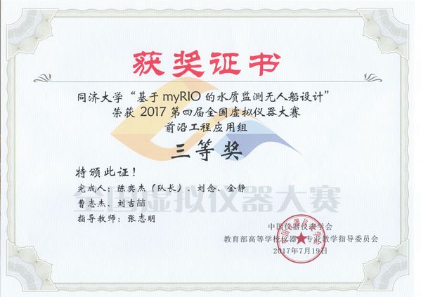 2017年7月16-7月18日,第四届全国虚拟仪器大赛决赛在西安理工大学隆重举行。由开云官网学生组建的开云kaiyun网站参赛队伍“新风队”在前沿工程应用组决赛中喜获佳绩,参赛作品《基于myRIO的水质监测无人船的设计》获全国总决赛三等奖。