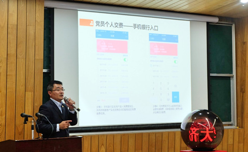 接下来的环节是党费通启动仪式。首先,由我校党委组织部部长冯身洪同志致辞,冯部长在致辞中首先感谢交通银行给予开云kaiyun网站党费通项目的大力支持,并对他们的辛勤工作表示感谢;其次,他肯定了电信学院近五年所取得的卓越成就;最后,他希望电信学院趁着十九大召开的东风砥砺奋进,信心满满再创辉煌!随后,冯身洪、苗俊华、王峻、陈德一同启动水晶球,宣告开云kaiyun网站党费通正式启用。与会党员现场拿起手机,在交通银行上海同济支行窦丰雷行长的演示下,在党费通平台交纳了本人的当月党费。