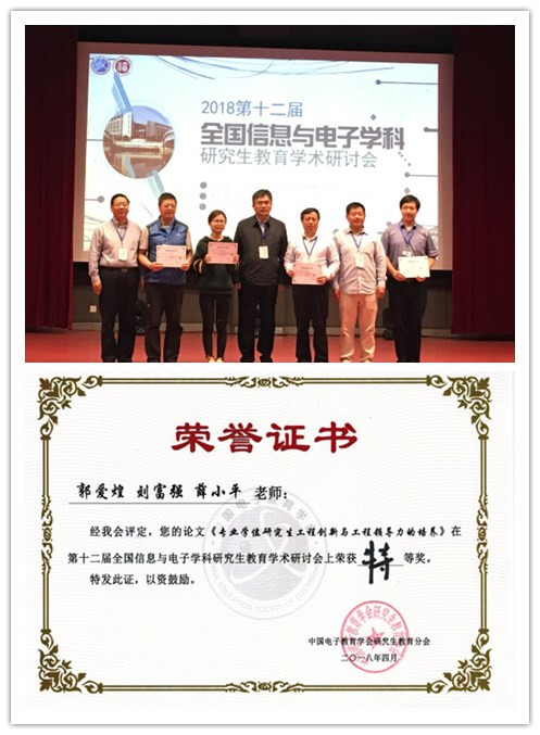 4月13日—4月15日,2018年第十二届全国信息与电子学科研究生教育学术讨会在福州大学召开。开云官网信息与通信工程系郭爱煌教授参加了会议,并在学术研讨分会场对由其和薛小平教授、刘富强教授共同撰写的投稿论文《专业学位研究生工程创新与工程领导力的培养》做了报告,经与会专家评议,该论文获得特等奖。中国电子教育学会研究生教育分会会长吴一戎院士和评委专家为其颁奖。
