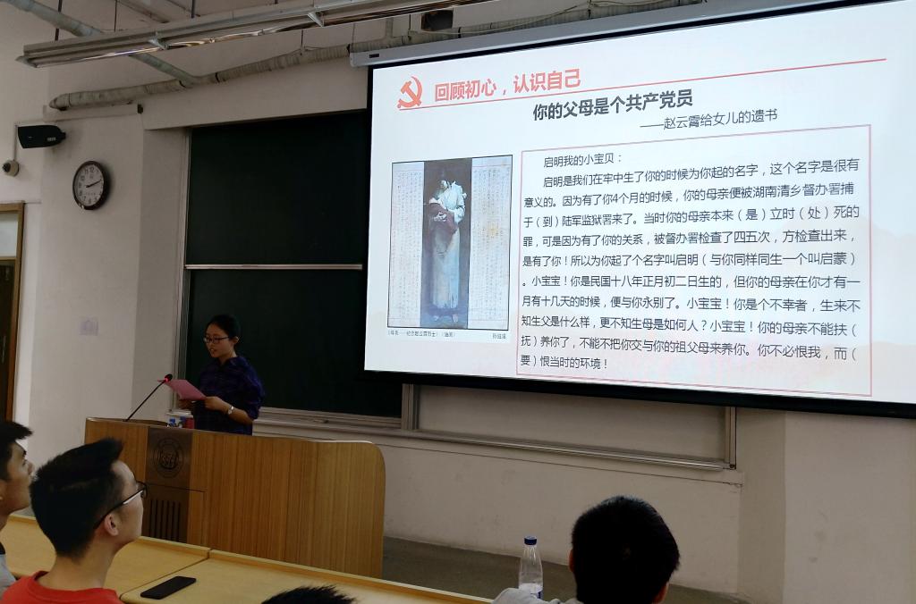 培训班邀请人文学院党委副书记刘涛副教授作了题为“与信仰对话——读红色家书,感悟信仰的力量”专题报告。刘老师以朗读《赵云霄烈士给女儿的信》和《刘伯坚狱中写给兄嫂的信》开题,以“回顾初心,认识自己”、“不忘初心,找回来时的路”和“牢记初心,践行信仰”等三个板块展开,从建党初心出发,结合中国的传统文化和共产党人所面临的国内外形势,讲述中国共产党的发展历史、共产党人的初心和信仰,结合生动的案例和丰富的史料,引导学员善于思考,积极实践,做时代新人,为实现中华民族伟大复兴的中国梦做出应有的贡献。(刘永焕)