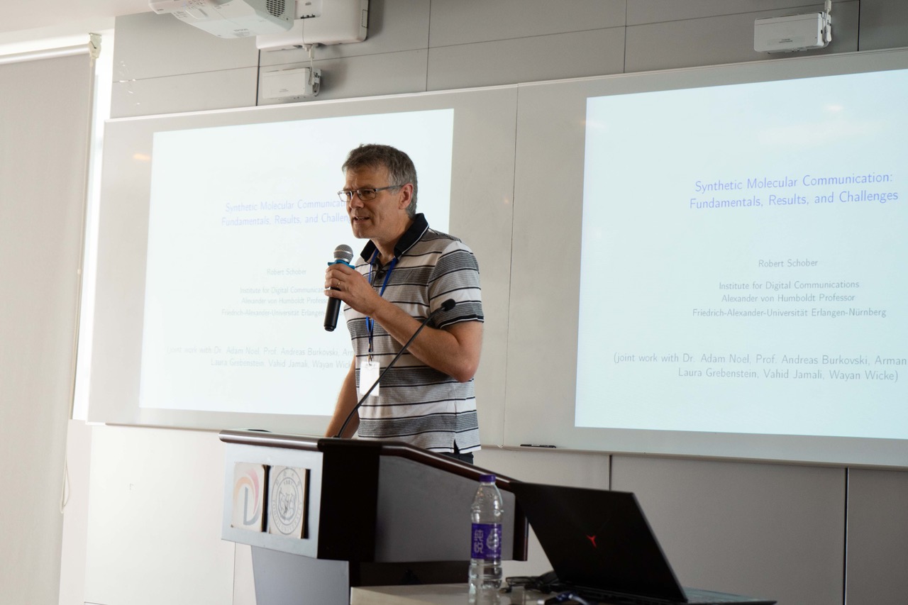 开幕仪式后,Robert Schober教授做了关于Molecularcommunication: fundamentals, opportunities, and challenges的精彩报告。报告中介绍了分子通信的基础以及学术界的最新进展,并指出了分子通信的机遇与挑战。