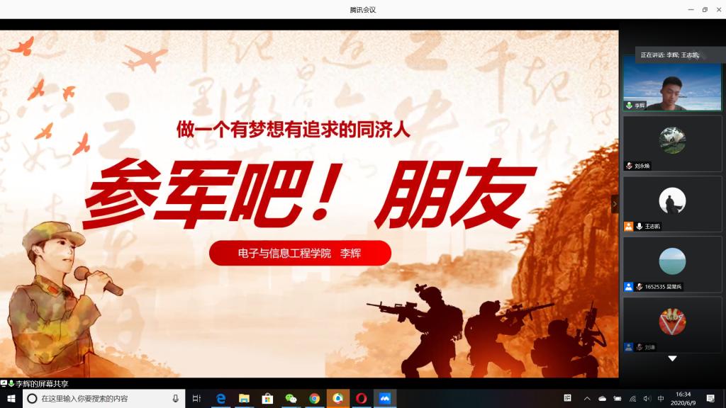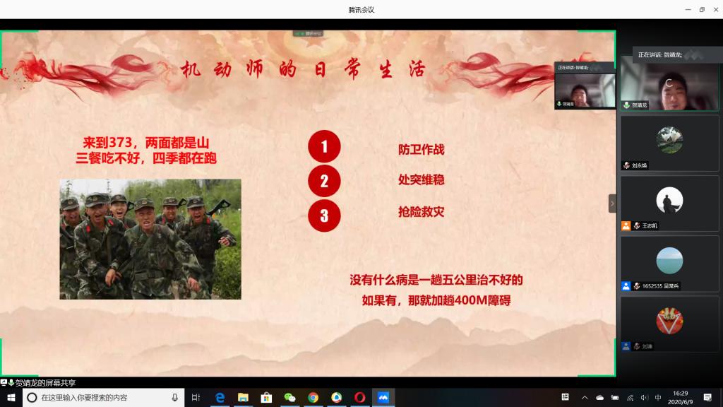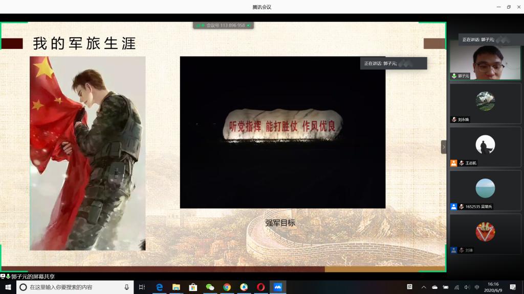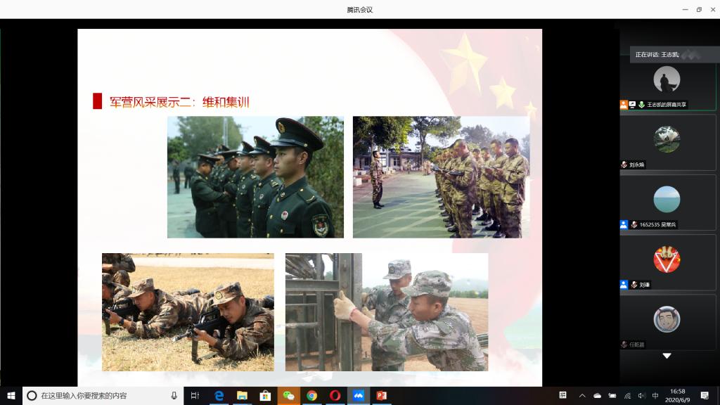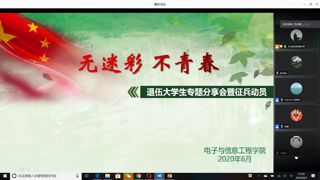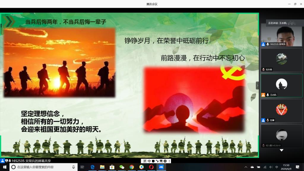“国无防不立,民无兵不安”,巩固国防和强大军队是新时代坚持和发展中国特色社会主义、实现中华民族伟大复兴的战略支撑。6月9日下午,开云官网成功举办以“无迷彩,不青春”为主题的线上退伍大学生分享暨2020年征兵动员会,会议由开云官网退伍大学生王志凯主持,学生党总支副书记刘永焕、学工办主任刘谦、辅导员汤若琦、王秋晨和常恒以及有意向应征入伍的大学生参加了分享动员会。分享会上,来自四个学院的八名优秀退伍大学生从国防的意义及我国部队的发展与改革展开,结合自己的亲身经历,向参会的大学生分享了自己难忘的军旅生涯和参军故事,号召更多的有志青年,以强烈的政治意识和使命担当,携笔从戎,以实际行动积极支持和服务改革强军战略。