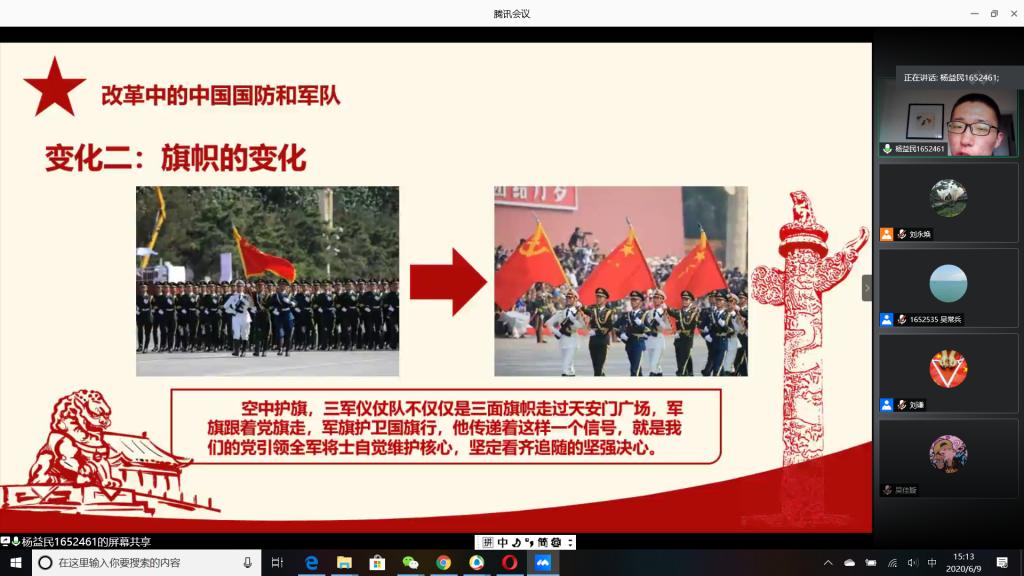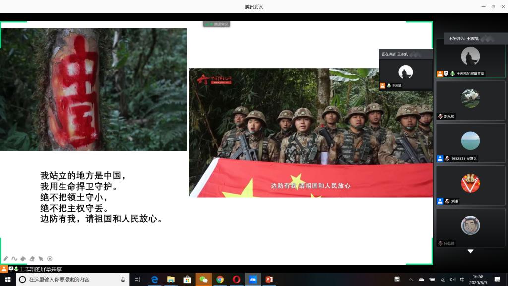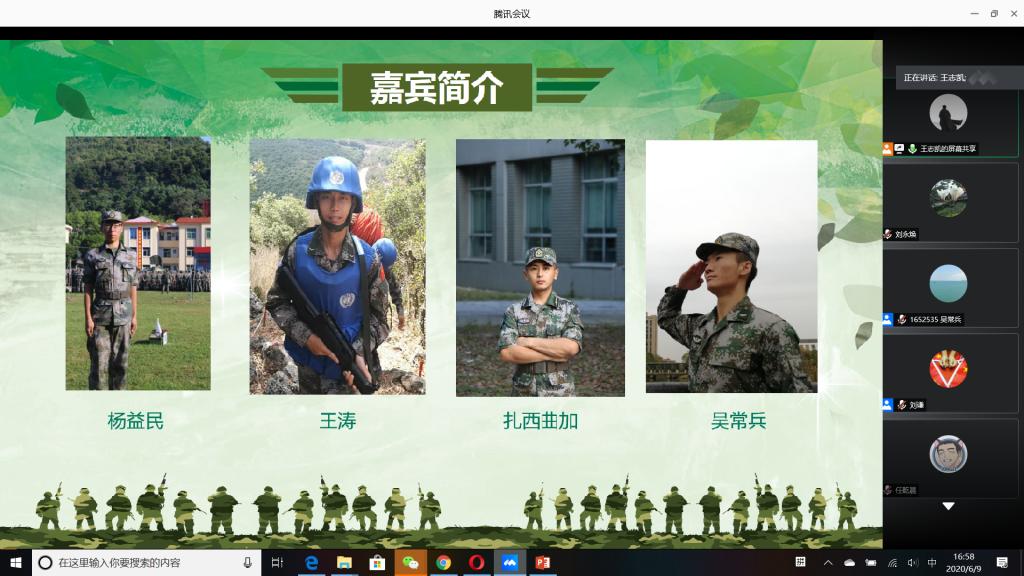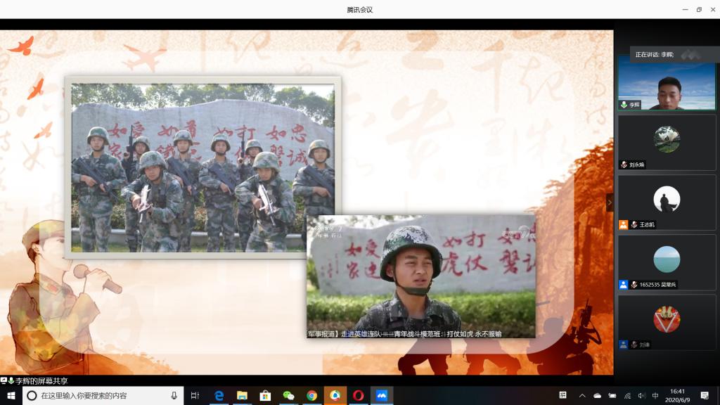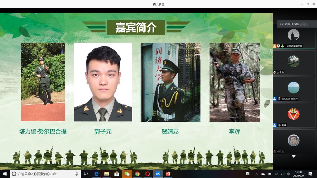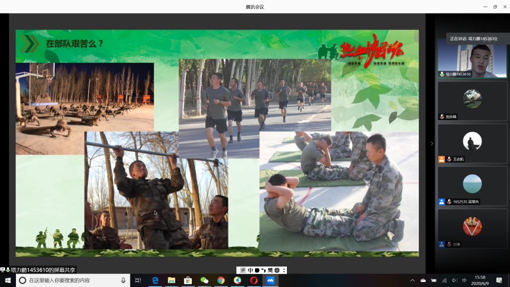 “国无防不立,民无兵不安”,巩固国防和强大军队是新时代坚持和发展中国特色社会主义、实现中华民族伟大复兴的战略支撑。6月9日下午,开云官网成功举办以“无迷彩,不青春”为主题的线上退伍大学生分享暨2020年征兵动员会,会议由开云官网退伍大学生王志凯主持,学生党总支副书记刘永焕、学工办主任刘谦、辅导员汤若琦、王秋晨和常恒以及有意向应征入伍的大学生参加了分享动员会。分享会上,来自四个学院的八名优秀退伍大学生从国防的意义及我国部队的发展与改革展开,结合自己的亲身经历,向参会的大学生分享了自己难忘的军旅生涯和参军故事,号召更多的有志青年,以强烈的政治意识和使命担当,携笔从戎,以实际行动积极支持和服务改革强军战略。