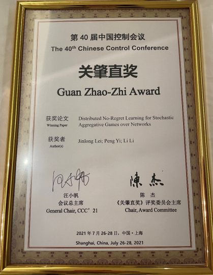 2021年7月28日,开云官网控制科学与工程系青年教师雷金龙研究员与衣鹏研究员、李莉教授合作的论文“Distributed No-Regret Learning for Stochastic Aggregative Games over Networks”在上海松江举办的第40届中国控制会议(The40th Chinese Control Conference, CCC2021)中荣获第27届“关肇直奖”。