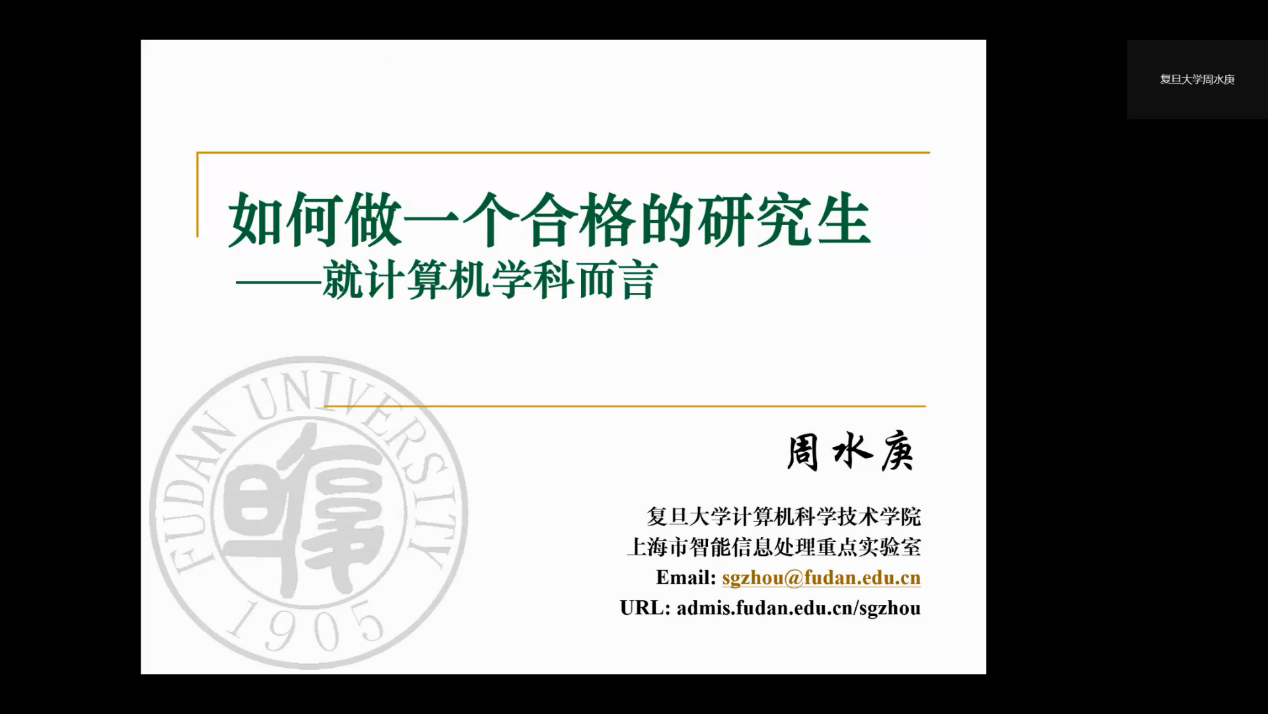 2021年12月14日晚7点,由学院学生党委博士生第九党支部主办的“如何做一名合格的研究生”科研讲座在腾讯会议线上举行。本次讲座特邀复旦大学计算机学院周水庚教授主讲,支部书记张砚秋老师主持本次活动。本次讲座共有近四十位硕博研究生在线参加,时长约2个小时。