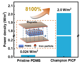 摩擦纳米发电机(Triboelectric Nanogenerator,TENG)因结构多样、制造工艺简单、成本低等优点,在微纳能源采集、自供电传感器件、蓝色能源等方面具有广泛的应用前景。在该论文中,研究人员提出了一种利用铁磁材料辅助提升TENG输出性能的方法。该方法以聚合物/铁粉复合薄膜作为介电材料,利用铁粉在时变电磁场中产生的磁化电流与TENG位移电流的耦合作用来提高TENG输出性能。