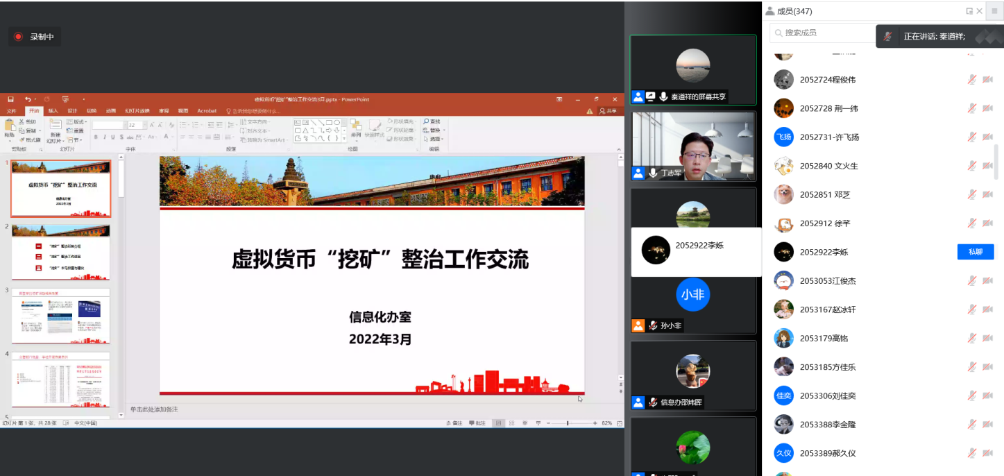 李睿副部长结合国家发改委、教育部关于整治虚拟货币“挖矿”行为的文件精神,明确了严查严处的方针,介绍了学校针对虚拟货币“挖矿”行为的排查整治情况,强调师生们要高度重视该项整治工作的严肃性,提高政治站位,强化责任意识,绝不参加主动“挖矿“,严防被动型“挖矿”。