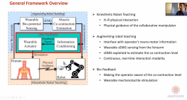 Gianluca Palli教授首先向大家介绍了机械手控制的应用和复杂可变型线性目标操纵的机器技术。然后详细介绍了先进的人机接口和辅助机器人的技术原理及工作过程,其中有控制机械手的接口、控制机器人假肢的接口、可穿戴辅助机器人等。接着又主要介绍了通过演示和增强动觉教学的规划技术,详细解释增强动觉教学技术的框架模型,该框架由动觉机器人教学、增强机器人教学及生物反馈三部分组成。而后又介绍了地面辅助机器人和物理人机交互,并进行实验仿真验证。最后介绍了增强动觉教学技术在人机接口及辅助机器人上的参数设置,分析了其关键环节的控制原理及过程,并给出实验案例进行验证其技术的有效性。