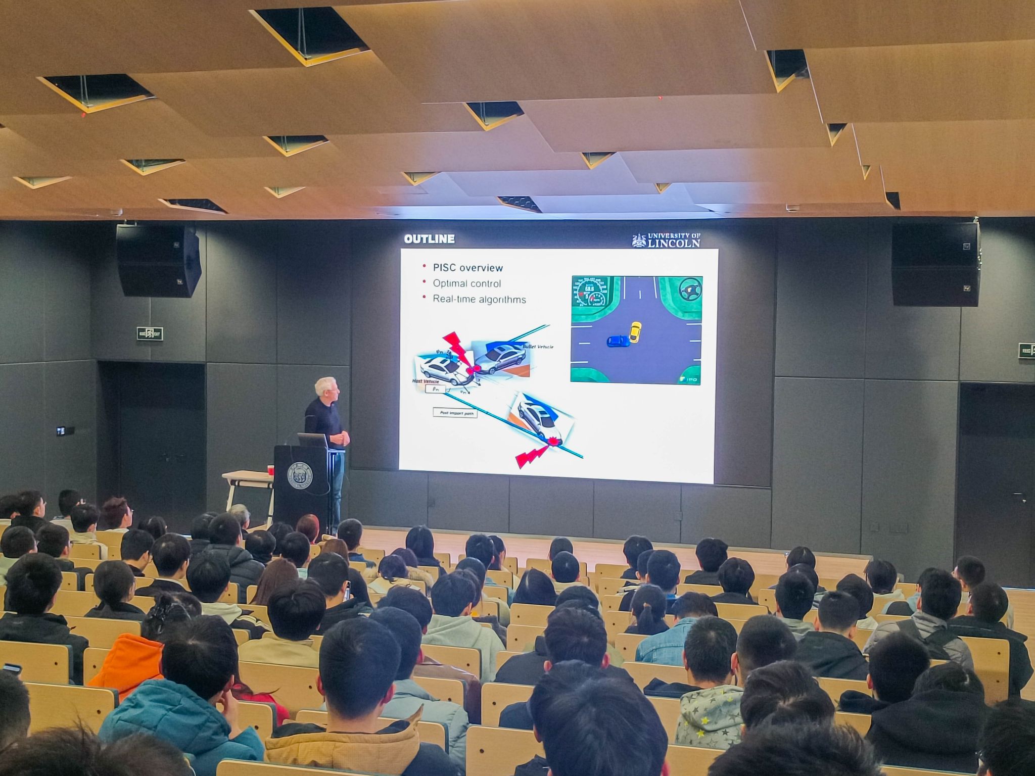 首先,Timothy Gordon教授对碰撞后稳定控制(PISC)进行了介绍,分析了车辆事故的危害、真实世界中碰撞事件及仿真软件中正面碰撞案例,并比较了有无PISC函数情况下稳定性控制效果。然后,他详细地介绍了PISC的三个阶段,包括PISC自动控制、稳定路径控制以及软切换到自动驾驶。接着,Timothy Gordon教授将碰撞后稳定控制问题建模为优化问题并使用庞氏极小值原理去解决,介绍了准线性最优控制良好的逼近了完全非线性最优控制。此外,Timothy Gordon教授还给出了碰撞后稳定性控制方案的结构以及前述优化问题的四个性能指标。最后,Timothy Gordon教授通过仿真和实验测试了PISC和其他不同的控制方案的有效性。
