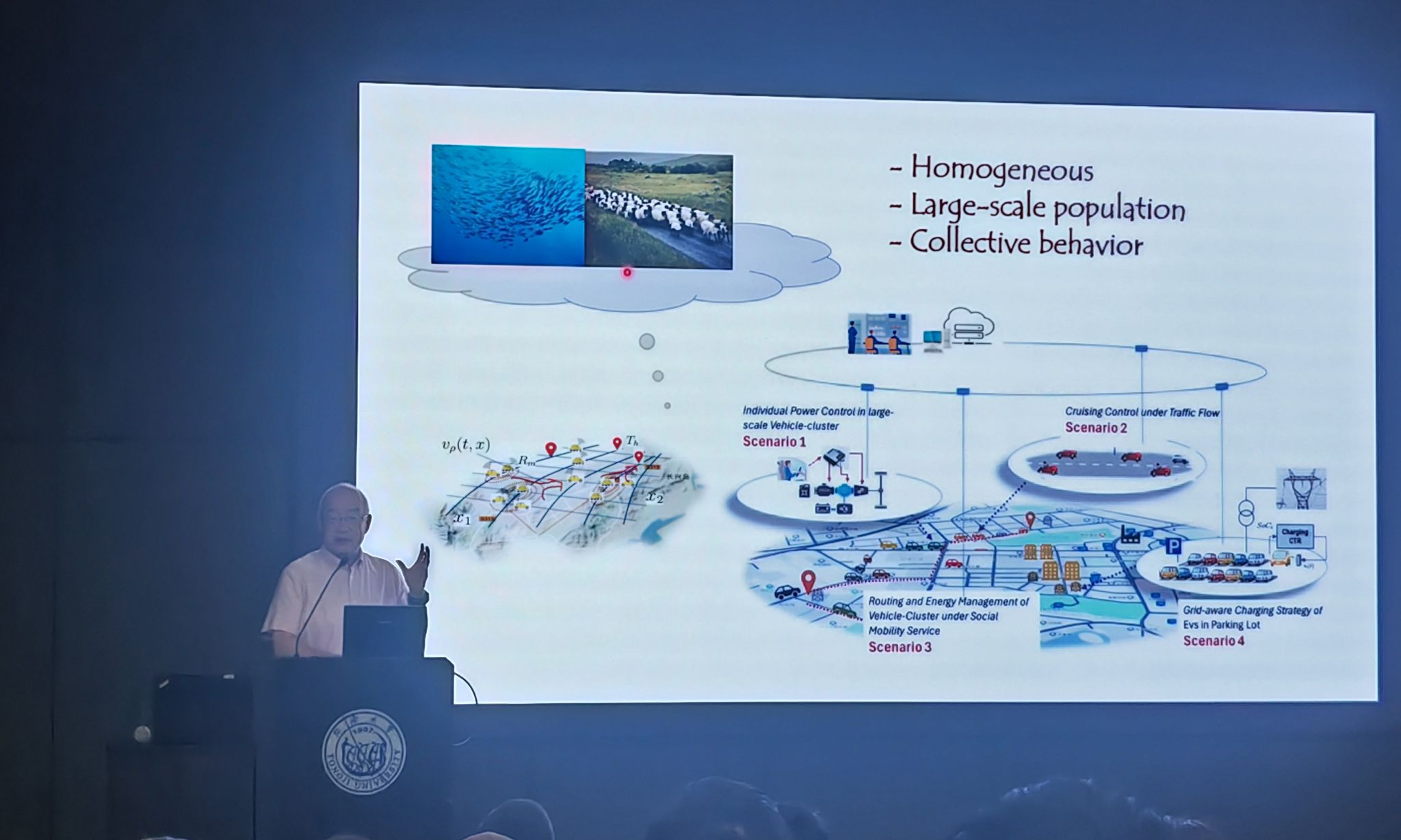 申铁龙教授首先介绍了在智能网联环境下大规模汽车社会中车辆之间的复杂相互作用,指出这种耦合关系为车辆的分布式控制带来了新的挑战。然后,他详细阐述了大规模智能体集群行为建模的平均场近似方法,并通过具体案例展示了基于平均场博弈框架的汽车动力系统分布式控制策略的设计。