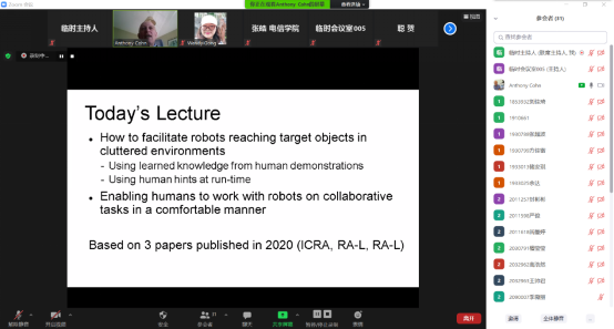 4月23日,英国利兹大学教授Anthony G Cohn应邀参加学院智·信讲堂,通过ZOOM线上形式,作了题为《混乱环境中机器人的交互与操控》学术报告,并与师生开展学术交流及探讨。