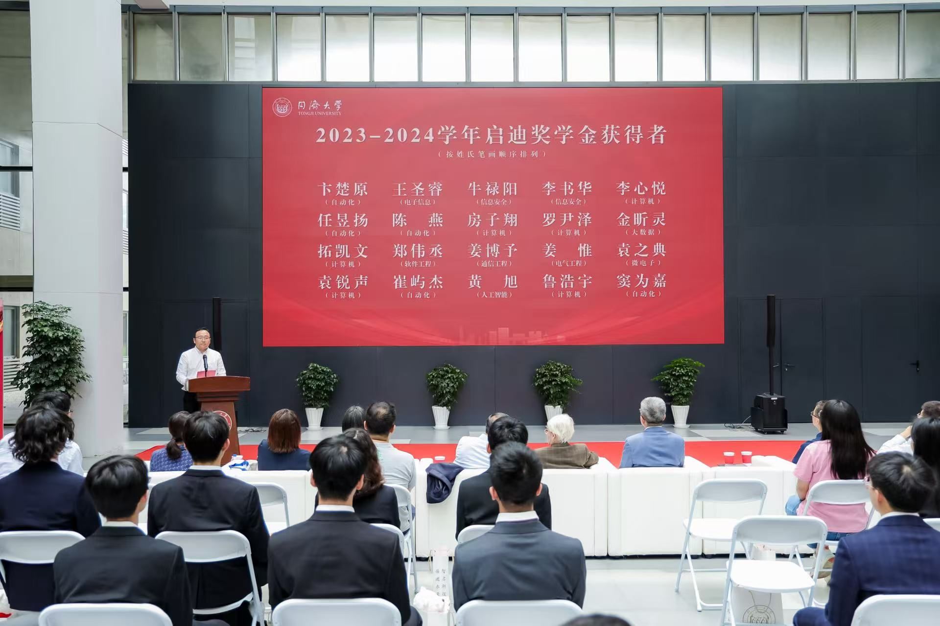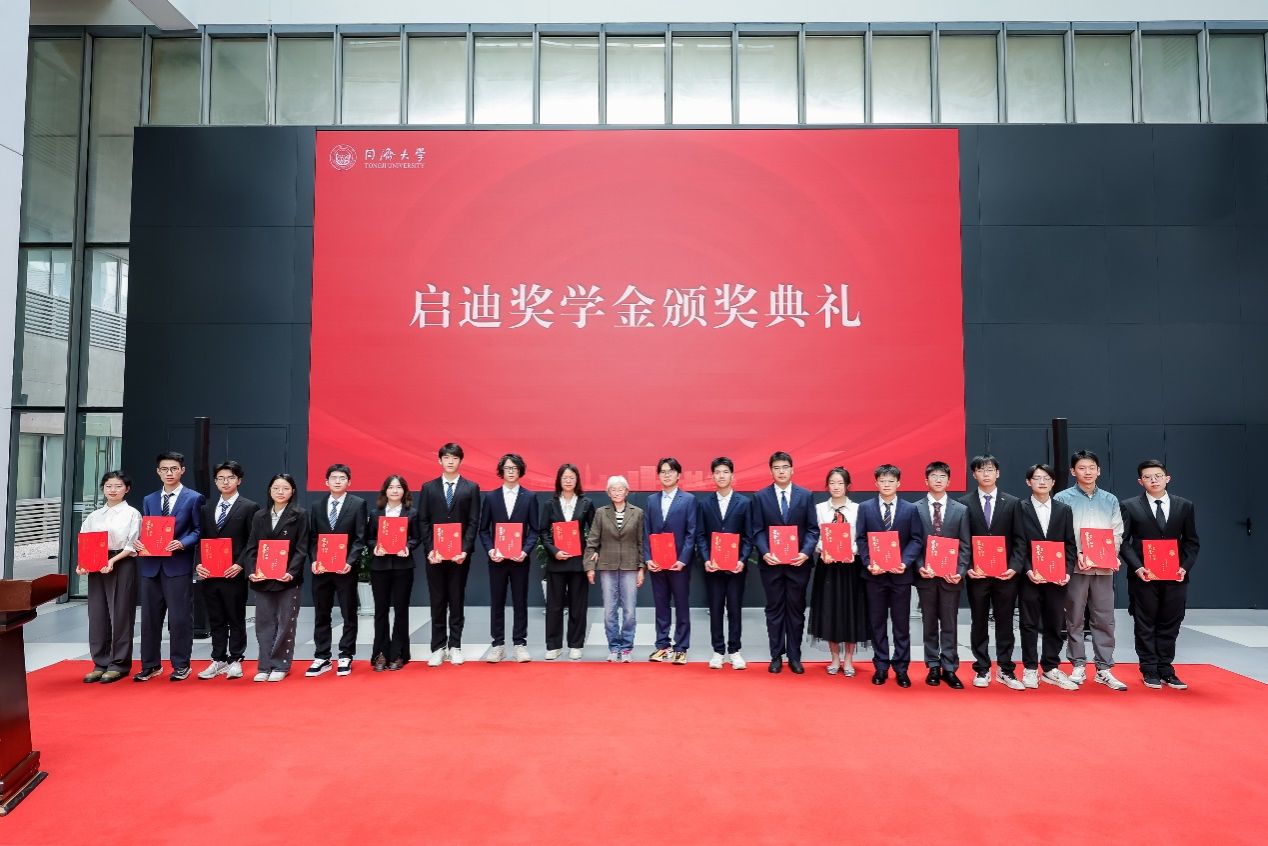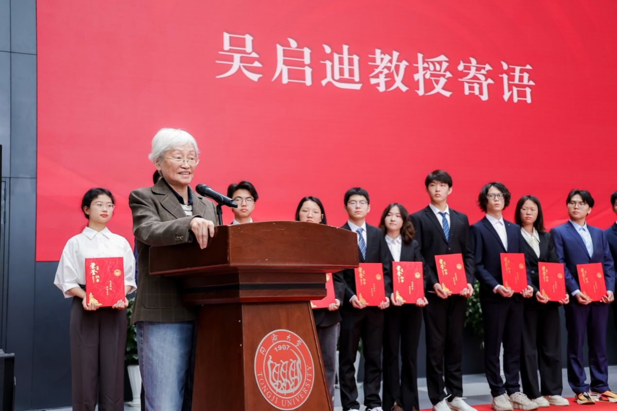 最后,吴启迪教授向全体获奖学子表示祝贺,同时也向所有为启迪奖学金贡献力量的捐赠人致以诚挚感谢。她指出,启迪奖学金的设立与发展,汇聚了众多心系人才培养的校友和教师的坚守与担当,也承载着对新时代同济学子在学术探索与工程实践中勇攀高峰的殷切期许。她着重强调了工程教育在人才培养中的战略地位和重要支撑,并勉励同学们积极参与高水平学科竞赛和科创项目,锻造系统思维、创新能力和工程素养。创新必须立足于实际工程应用,不能仅停留在理论层面,希望同学们在复杂工程问题的求解过程中锤炼跨学科知识整合能力,在真实工程场景的攻坚克难中培育严谨求实的工匠精神,真正成长为能解决“卡脖子”技术难题、具有国际竞争力的卓越工程师。