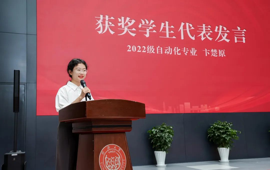 获奖学生代表2022级自动化专业本科生卞楚原发言。她首先代表全体获奖学子向启迪奖学金捐赠者和老师们致以崇高的敬意和由衷的感谢。她说到,荣获启迪奖学金不仅是对其阶段性成长的鼓励,更是对全体学子躬身实践、勇于探索的高度认可。面对复杂多变的环境,新时代青年学子更要坚信所学所做的价值,坚持在实践中砥砺专业判断、锤炼动手能力,以德修身、以知报国,做时代的参与者和建设者。吴启迪教授以实际行动证明,女性同样可以在工科领域大放异彩,在吴教授的精神引领下,她将更加自信地站在科技前沿,用坚韧与智慧诠释新时代女性的力量。当代青年生逢其时、肩负重任,更应珍惜当下、不断精进,传承启迪奖学金精神,立志为国分忧、为民奉献,以所学服务社会,不负时代所托。