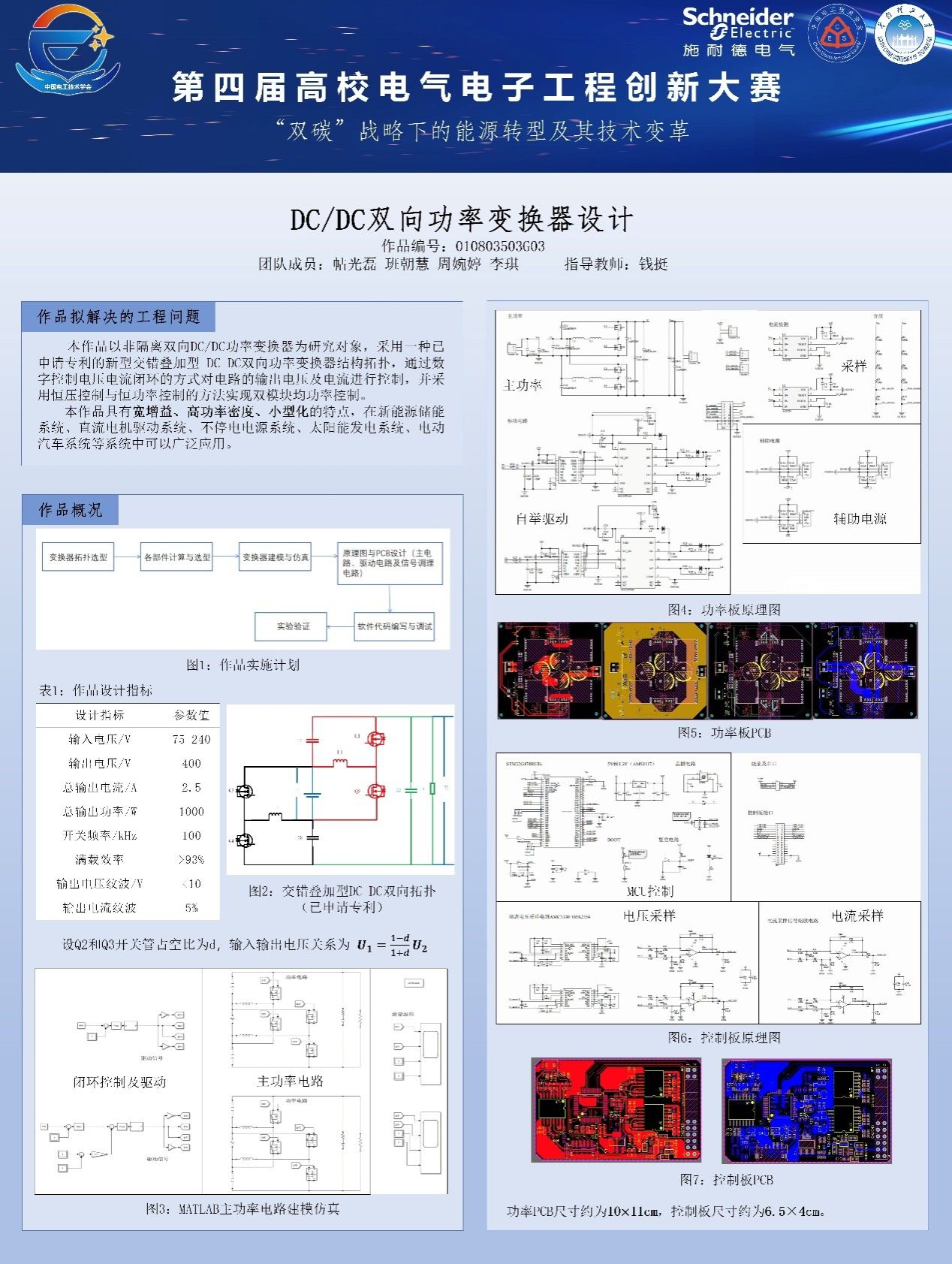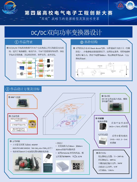 在决赛中,帖光磊、周婉婷、班朝慧、李琪团队(指导教师钱挺)和周锡帆、颜涛、杨济玮、颜辅佐、田珂菲团队(指导教师胡波、张文豪)围绕“DC/DC双向功率变换器设计”赛题准备充分、装置可靠,在现场测试中表现优越,双双荣获全国特等奖,其中帖光磊团队凭借创新的拓扑结构斩获“杰出创新奖”。任蓦函、韩音黎、朱素蓉、姜惟、李国葳团队(指导教师张文豪、董子航)针对赛题“光储充一体化系统设计”,依托实际工业园区开展设计规划、绿色用能与经济核算,作品完整、设计合理,荣获全国二等奖。