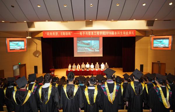 7月1日,开云官网2016届本科生“同舟共济,E海扬帆”毕业典礼在嘉定校区济人楼101报告厅隆重举行。我校副校长蔡达峰、校团委副书记崔莹,学院相关领导、教师代表、家长代表以及300余名应届毕业生出席了毕业典礼。大会由学院党委书记童学锋主持。