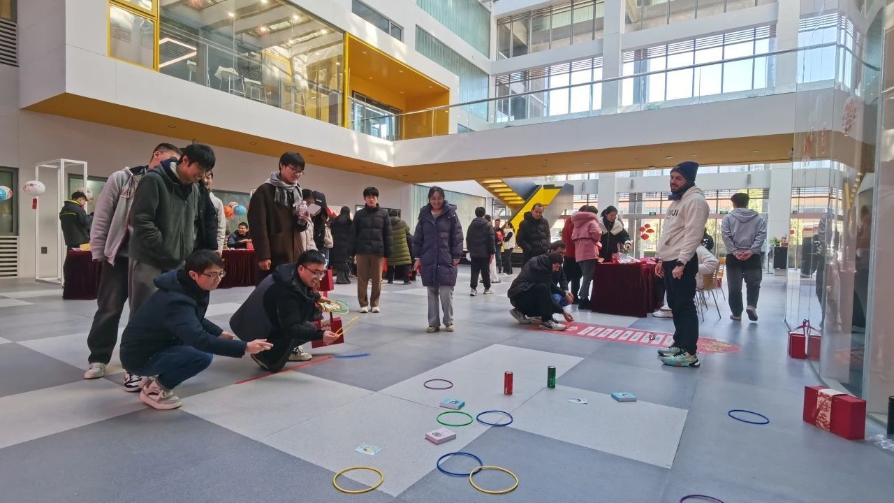 在游戏区,套圈、猜灯谜等互动环节让同学们尽情放松、开心娱乐。大家全神贯注、积极参与,现场的氛围欢快而热烈。