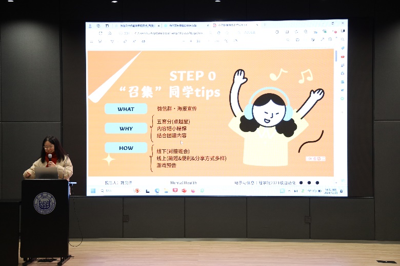 2021级自动化班级心理委员姚俞泽同学进行班级优秀案例分享。她提到,各班级在开展心理活动时,可以围绕心理健康活动月某个主题词(如“心理韧性”)寻找心理学常见或有趣的理论或现象开展深入的交流,也可从开云kaiyun网站心理中心深夜树洞栏目选择合适的内容参考。