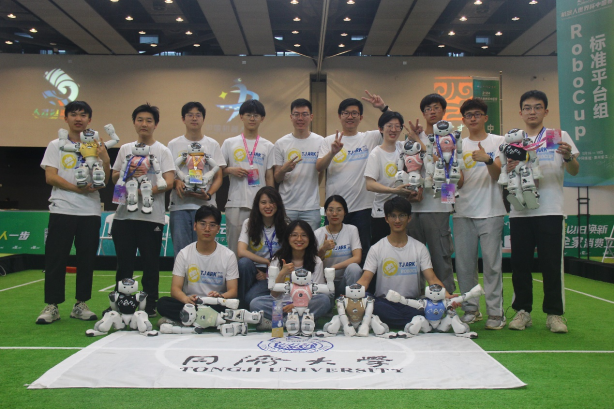 RoboCup 足球机器人-标准平台组旨在以对抗场景在统一硬件平台上检验各队伍算法与决策水平,涉及实时感知、仿生行走、多机协作等算法,是技术难度最大、关注度最高、观赏性最强的组别。该项竞赛中,TJArk是唯一实现裁判手势视觉识别的队伍,凭借稳定的底层算法、出色的团队决策,以全胜战绩获得冠军,实现该组别11连冠。