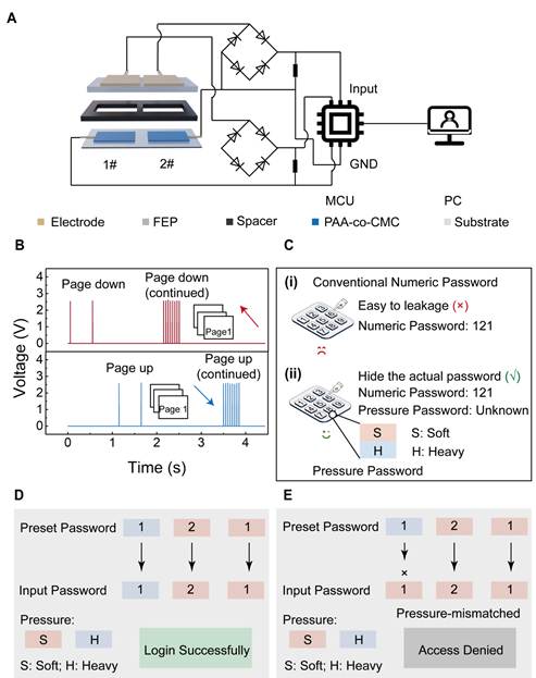 图2展示了应用方面的验证。团队开发的触觉按钮与传感器阵列表现优异,不仅能实现滑动翻页、密码输入等基础交互功能,更创新性地将按压力度纳入密码识别维度,通过“软压(2.5-4.0V)”与“重压(> 4.0V)”的电压差异,构建“数字+压力”双重加密体系,大幅提升交互安全性。