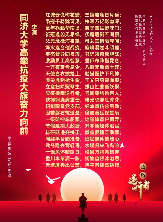 电信学院图书馆副馆长李清老师原创七言长律,向奋战在前线的医护和志士表示由衷的敬意,抗疫必将胜利!