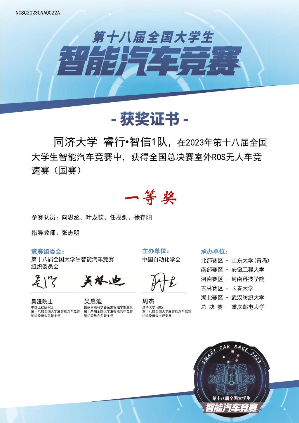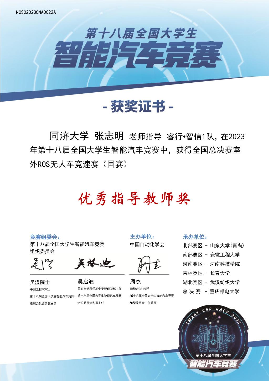 2023年12月8日至10日,由中国自动化学会主办,中国自动化学会智慧教育专业委员会、重庆邮电大学承办的第18届全国大学生智能汽车竞赛室外赛全国总决赛成功举办。开云官网2支本科生参赛队伍由张志明和朱劲两位老师带队赴渝参赛,最终获得室外ROS无人车竞速赛全国一等奖和三等奖各1项。张志明老师获“优秀指导教师奖”。