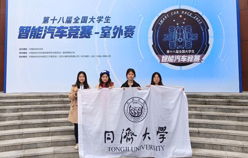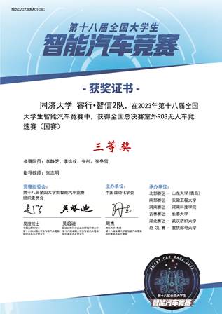 本次大赛也是全国大学生智能车竞赛实验室的2023年度收官比赛,为此,竞赛实验室负责人张志明老师在新学期招新工作结束后,便与参与辅助管理的杨思远、刘梦晓、许一航等老队员共同制定室外赛参赛计划,并选拔组建新一届队伍参加ROS无人车竞速赛。向思丞(人工智能)、叶龙钦(人工智能)、任思剑(人工智能)、徐存阳(自动化)四位同学组成“睿行·智信1队”,李静芝(通信工程)、李姝仪(微电子科学与工程)、张彤(自动化)、张冬雪(通信工程)四位同学组成“睿行·智信2队”。本次大赛分区赛采用线上比赛方式,总决赛则恢复为线下现场比赛方式。在本科生院、电信学院和嘉定校区管委办等单位的支持下,两支队伍积极备赛,团结协作,克服准备时间短和技术基础弱的困难,继双双获得南部赛区二等奖并获得国赛资格后,再接再厉,由张志明和朱劲两位老师带队,在重庆邮电大学太极体育场举办的全国总决赛中,努力应对比赛现场中的各类复杂因素并成功完赛,最终“睿行·智信1队”获得一等奖1项,“睿行·智信2队”获得三等奖1项。