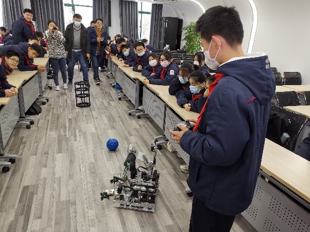 随后,创新基地的三大机器人团队各显神通,向中学生们“秀”出了形态各异的智能机器人。张志明老师代表智能车竞赛团队带来了轮式机器人,周伟老师和刘一本、程珺飞同学代表VEX竞赛团队带来了VEX机器人,袁家遥同学代表RoboCup竞赛团队带来了TJArk足球机器人。在视频展示和知识讲解环节,中学生们听得全神贯注,看得兴趣盎然;在互动体验环节,中学生们更是争先恐后地要试着亲手操控机器人,亲身感受种种“智能感知”“智能决策”“智能行动”,现场不时爆出热烈的欢笑声。